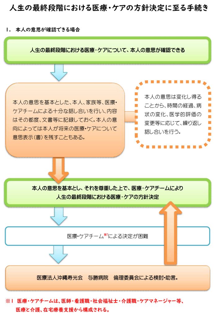 - ①本人の意思が確認できる場合本人・家族等と医療・ケアチームとの十分な話し合いを行い、本人の意思決定を基本とした医療・ケアの方針を決める。