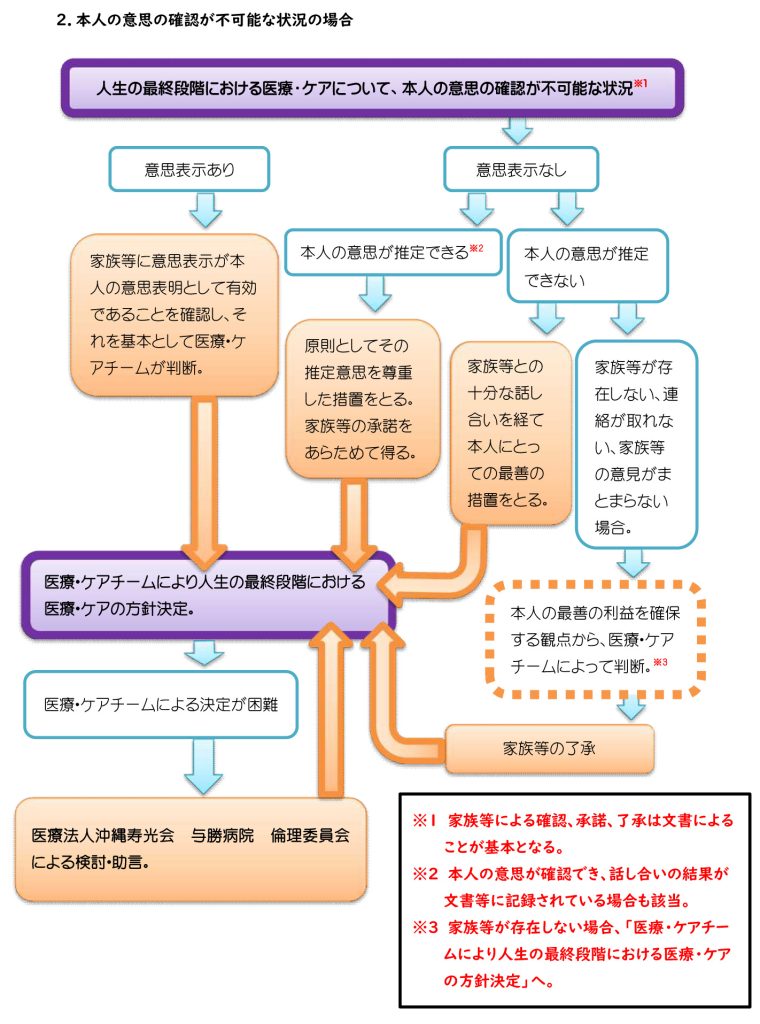 - ②本人の意思が確認できない場合や判断能力がない場合家族等が本人の意思を推定し、その推定した意思を尊重し、医療・ケアチームで方針を決定する。家族等が本人の意思を推定できない場合は、本人にとって何が最善であるか、医療・ケアチームと家族等で繰り返し話し合う。 家族等がいない場合および家族等が判断を医療・ケアチームに委ねる場合は、 本人にとっての最善の方針を繰り返し話し合い決定する。